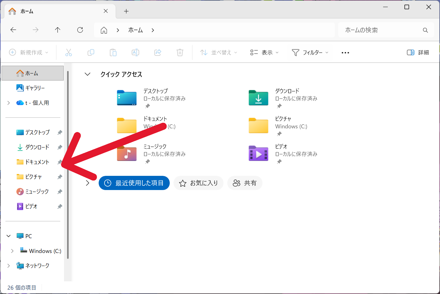 エクスプローラーを開くと、左側に「クイックアクセス」という項目が表示されます。ここには、最近使ったフォルダや、よく利用する場所を登録しておくことができます。