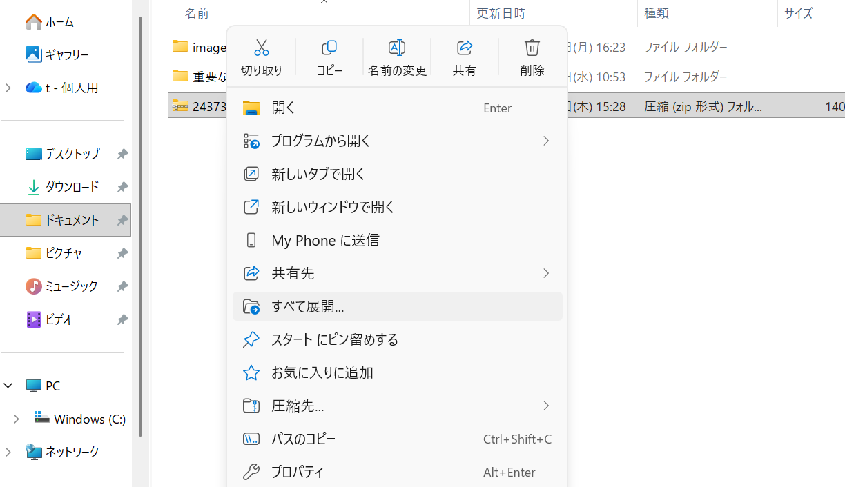 zipファイルを選択して右クリックし、「すべて展開」を選択すると、zipファイルの展開が始まります。展開後は、通常のファイルと同じように開いたり移動したりすることができます。