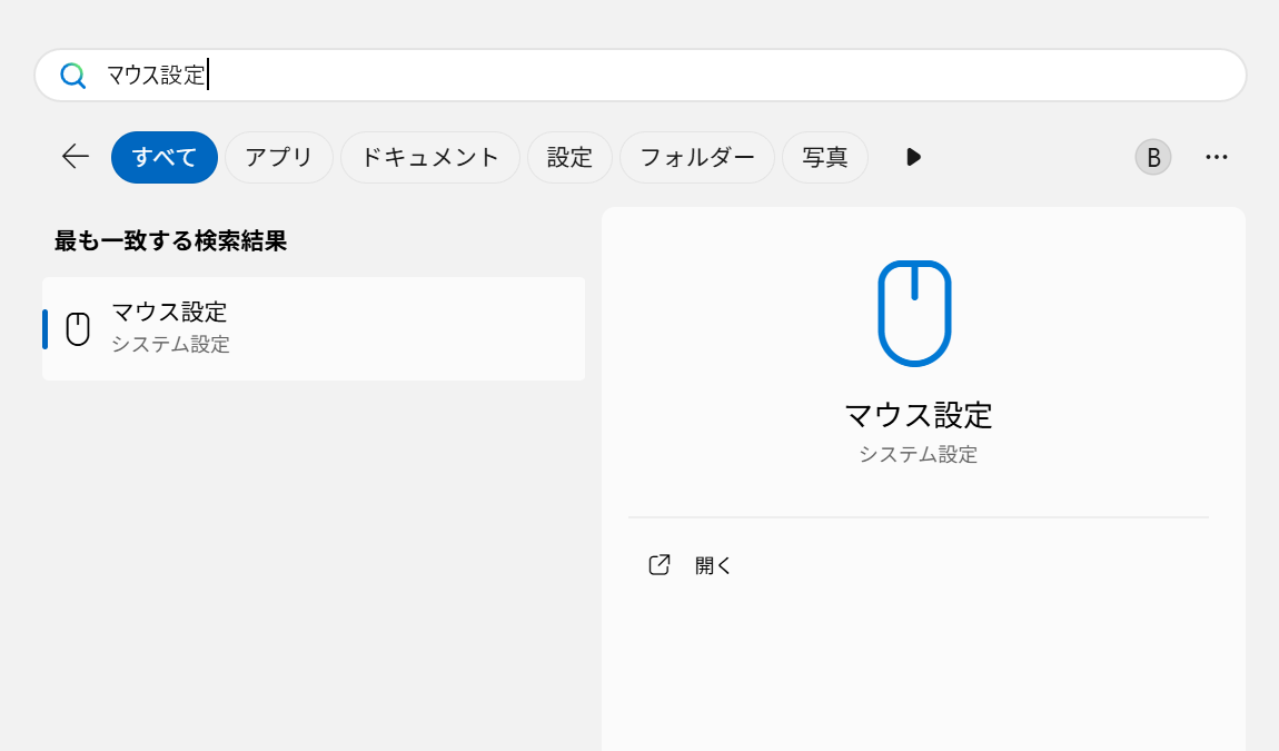 マウスの設定画面を開くには、Windowsキーの横にある検索欄に「マウス設定」と入力しましょう。