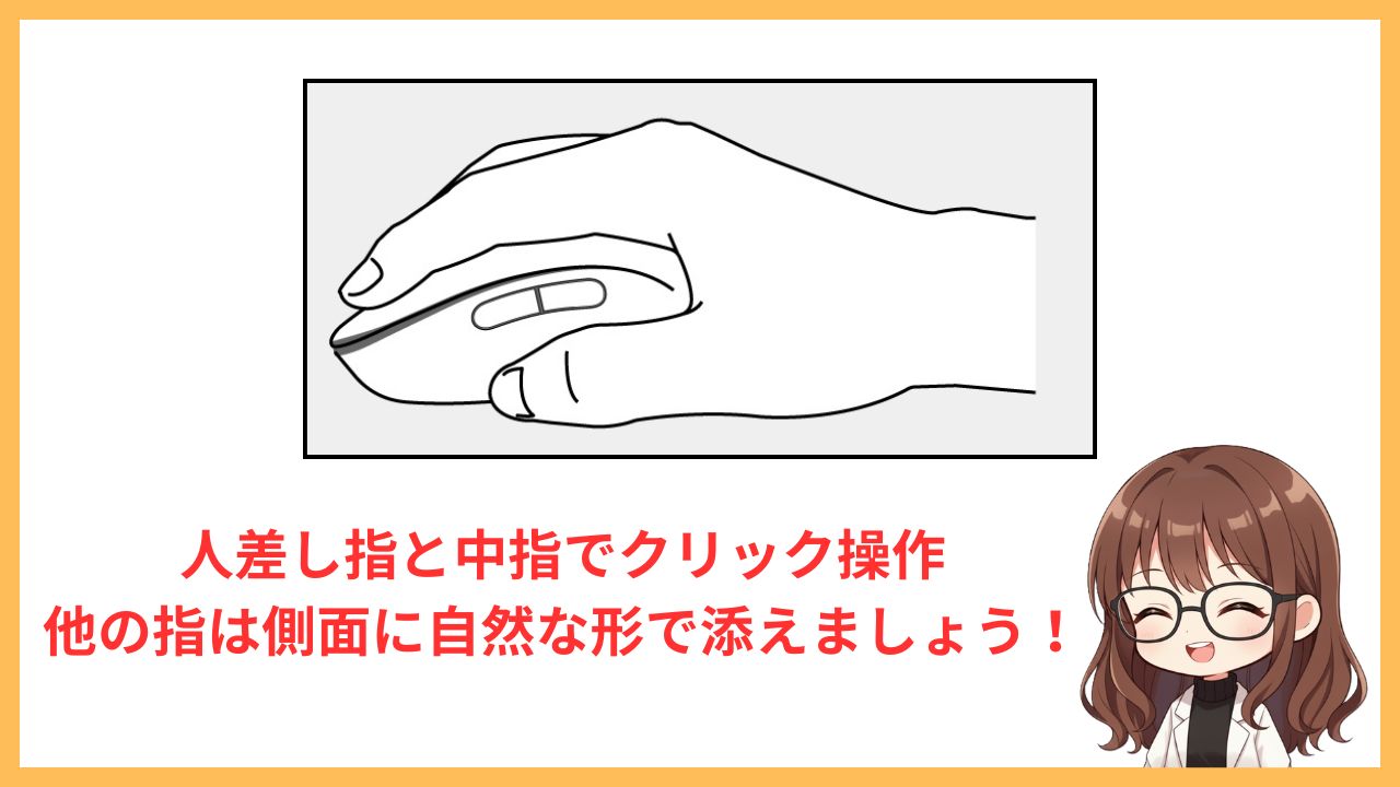基本的には「手のひらを軽くマウスに乗せ、指先でボタンを操作する」というイメージです。中指と人差し指をそれぞれ左ボタン・右ボタンの上に軽く置き、親指はマウスの左側面に添えます。薬指・小指は右側に自然な形で添えましょう。