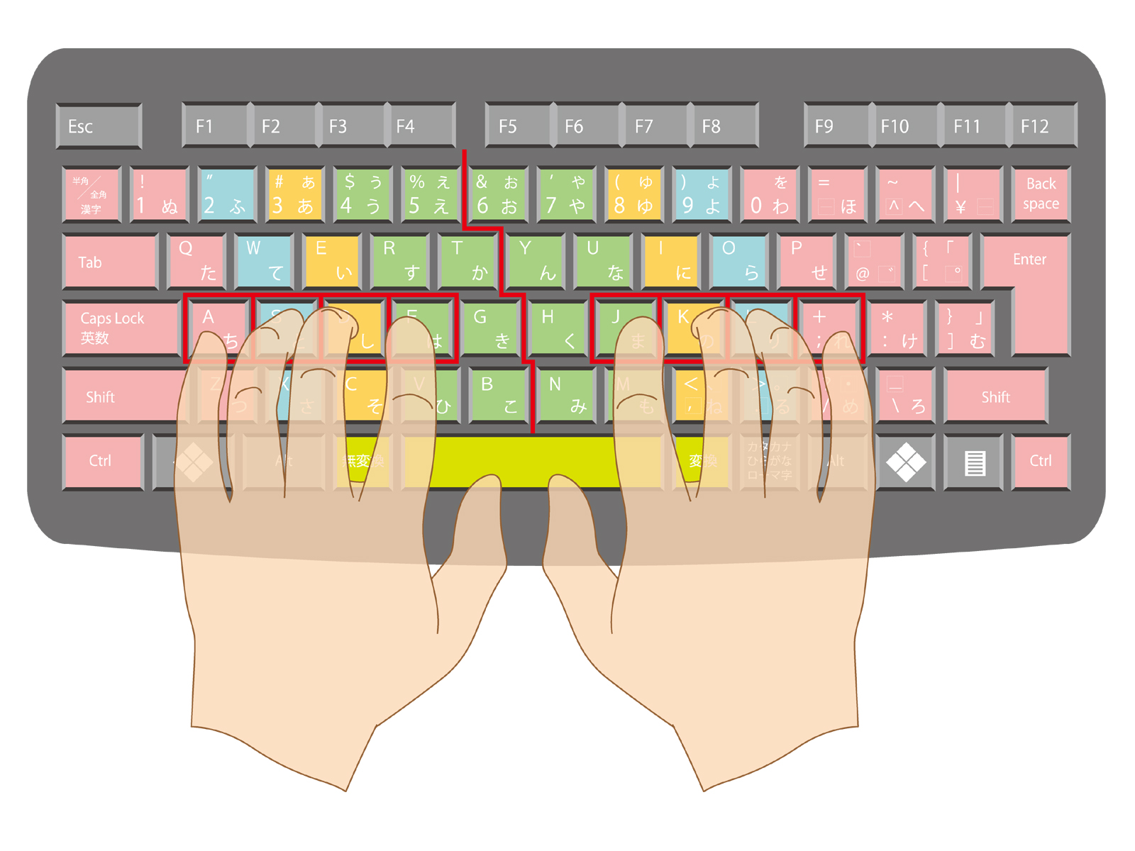 タイピングの基本は、まず「ホームポジション」をしっかり覚えることです。ホームポジションとは、タイピングをする際に指を置く“基準の位置”のことです。