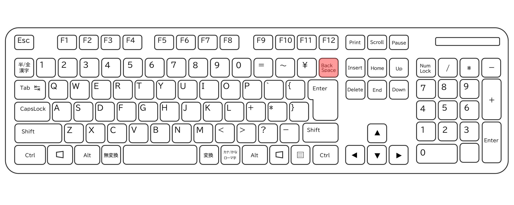 BackSpaceは文章を削除する時に使うキーです。Enterキーの上に付いています。