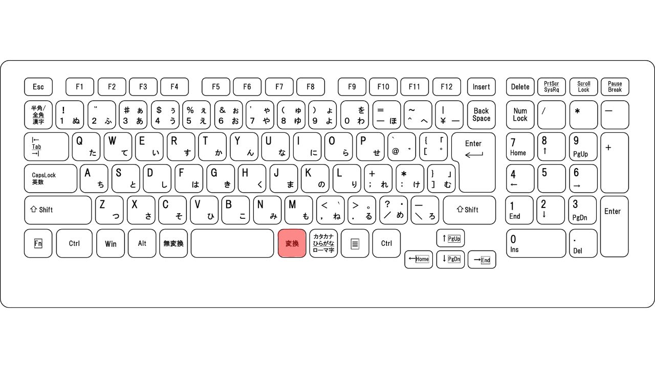 変換キーはその名の通り、入力された文字を変換するためのキーです。Spaceキーの右側に付いています。(キーボードによっては変換キーが無い場合もあります。)