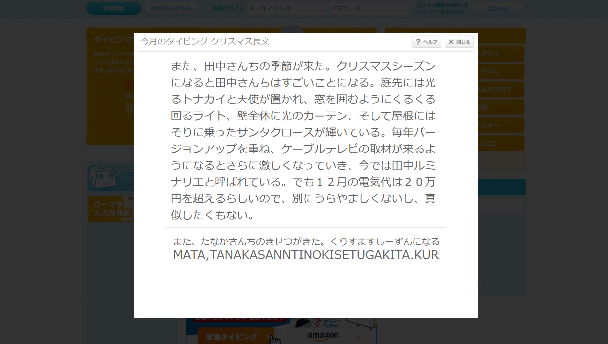 長文の練習では他のサイトよりもかなり長い文章がお題として提示されます。「。」や「、」など、他のサイトではなかなか練習できないキーも練習できるため、ある程度タイピングができるようになったら挑戦してみましょう。