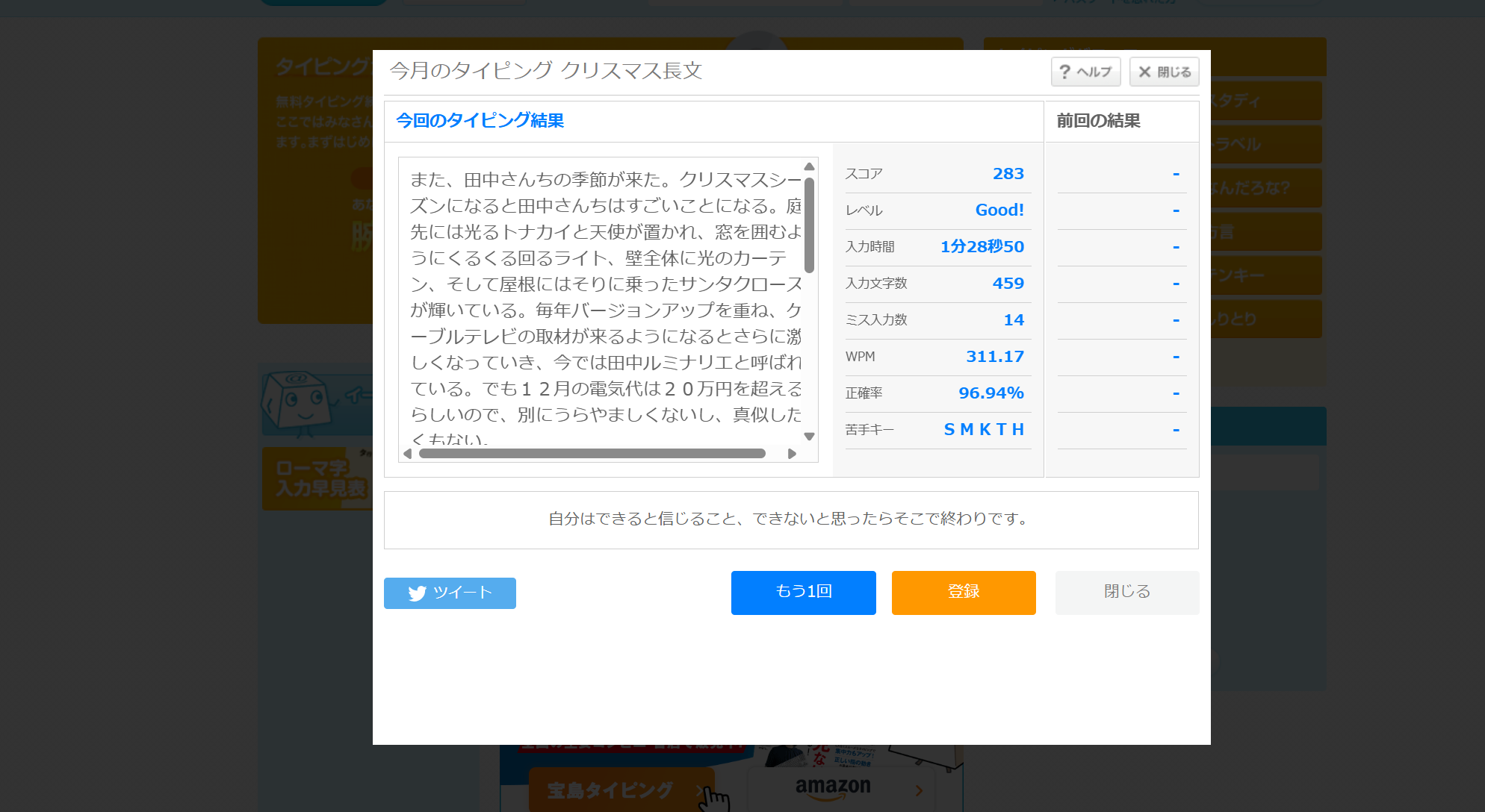 もちろん中級者用の練習も用意されており、特訓や腕試しでは少し長めの文章をタイピングして、速度やミスタイプ率を計測することができます。