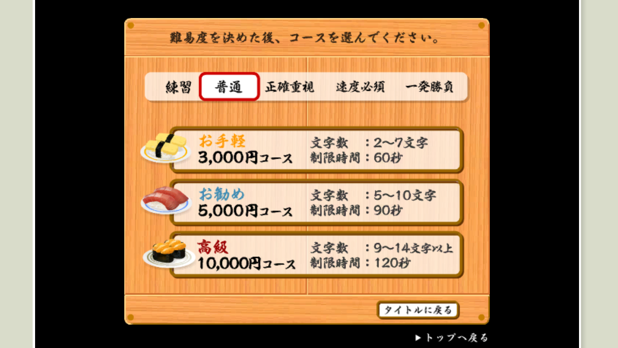 基本的には普通コースから自分に合った難易度を選ぶのがおすすめ。タイピングにまだ慣れていない方は練習コースを、タイピングの腕前をさらに上げたいならそれ以外の高難易度コースを選びましょう。