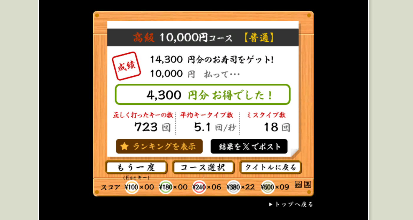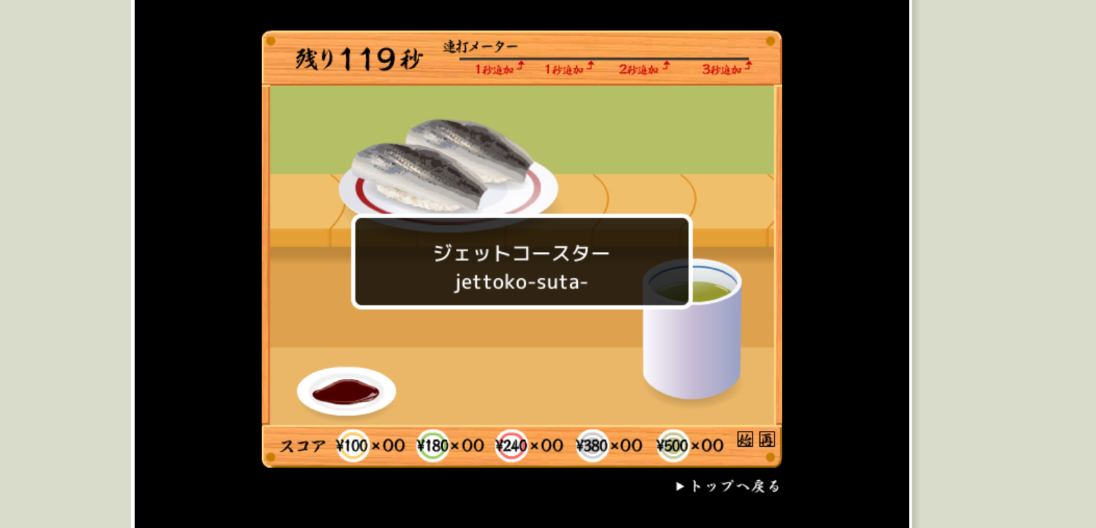 ゲームを開始するとお寿司とタイピングする文章が表示されます。お寿司が右に流れて行ってしまう前にタイピングできればポイントゲットです。