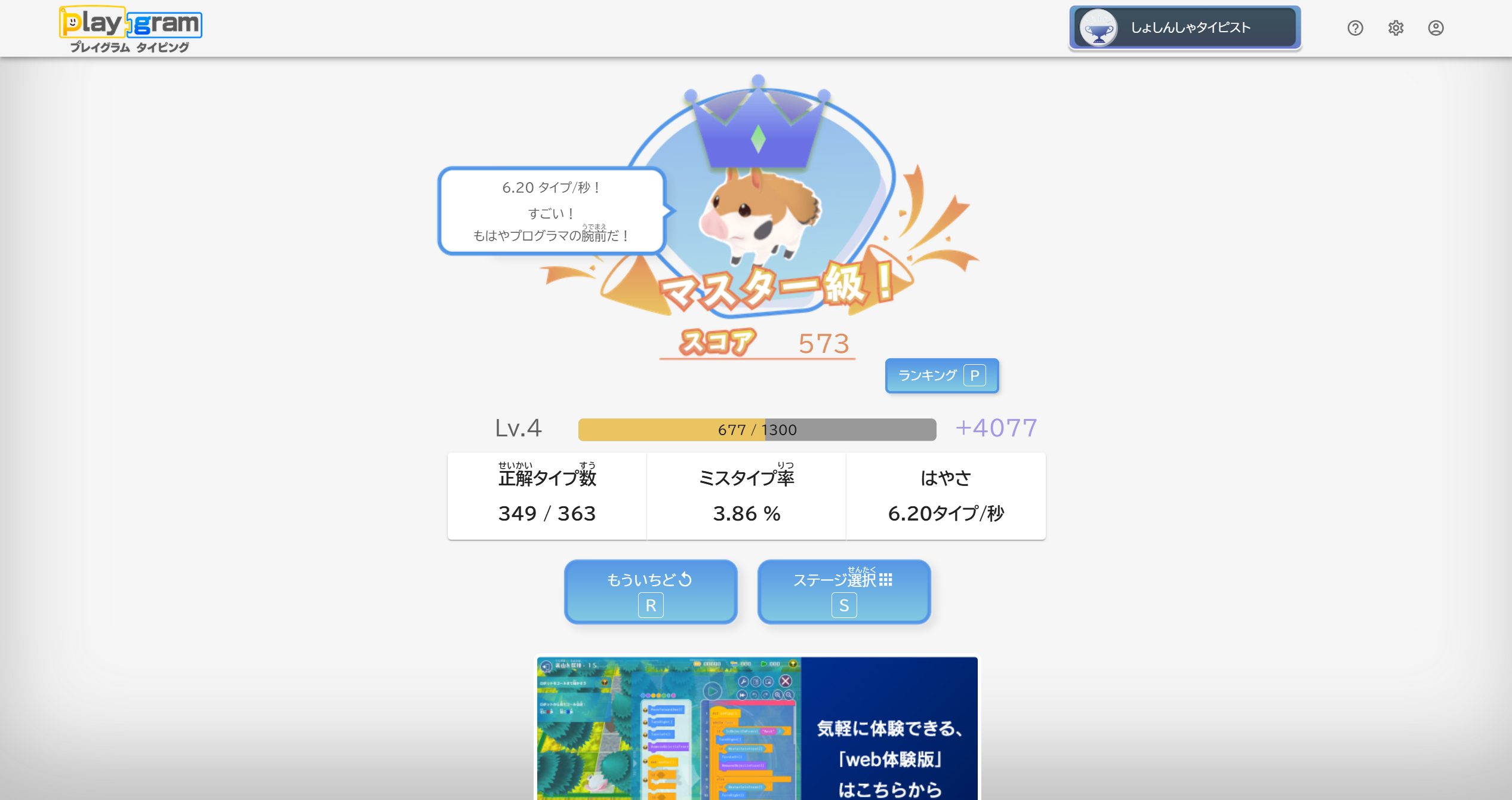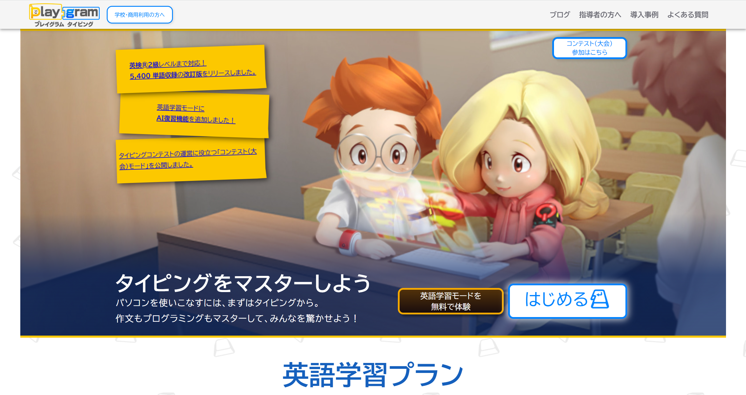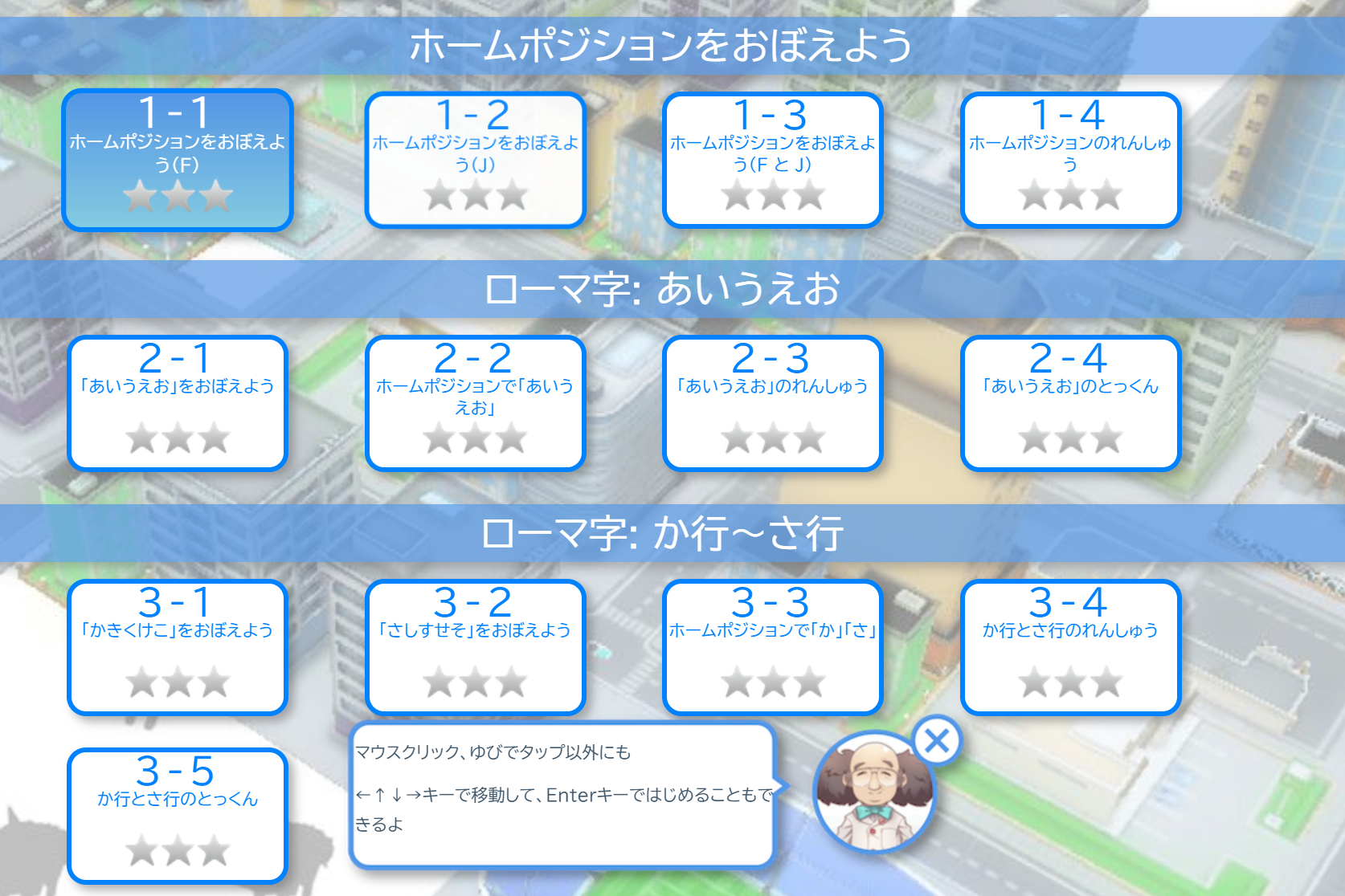 タイピングをしているときの音も心地よく、楽しく学べるサイトになっています。まずは基礎練習から始め、腕試しで3タイプ/秒を目標に取り組むと良いでしょう。