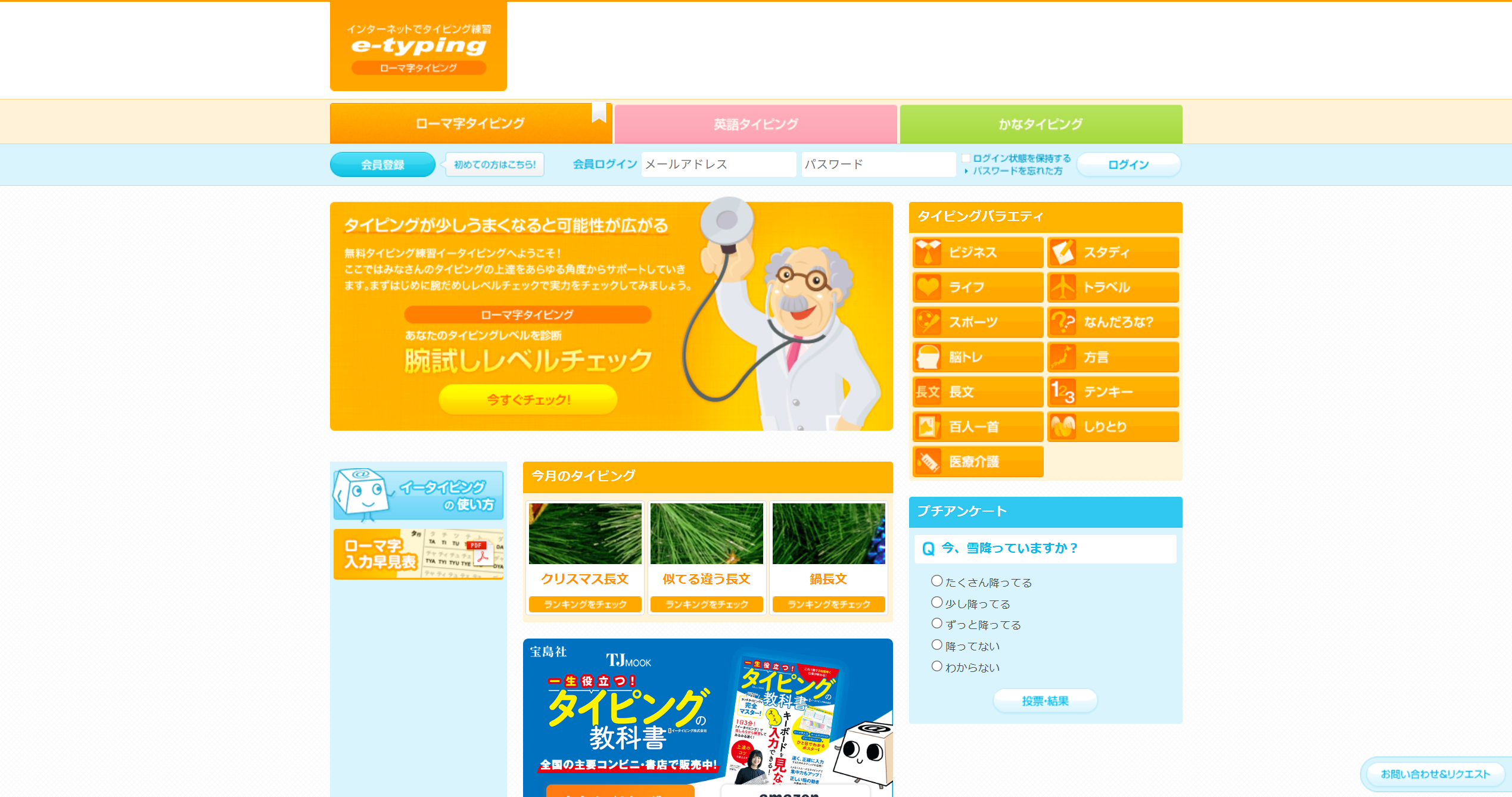 e-typingはバリエーションの豊富さが特徴のサイトです。ビジネス文章のタイピング、季節に合わせた文章のタイピングなど練習項目が豊富で、飽きずに練習を継続することができます。