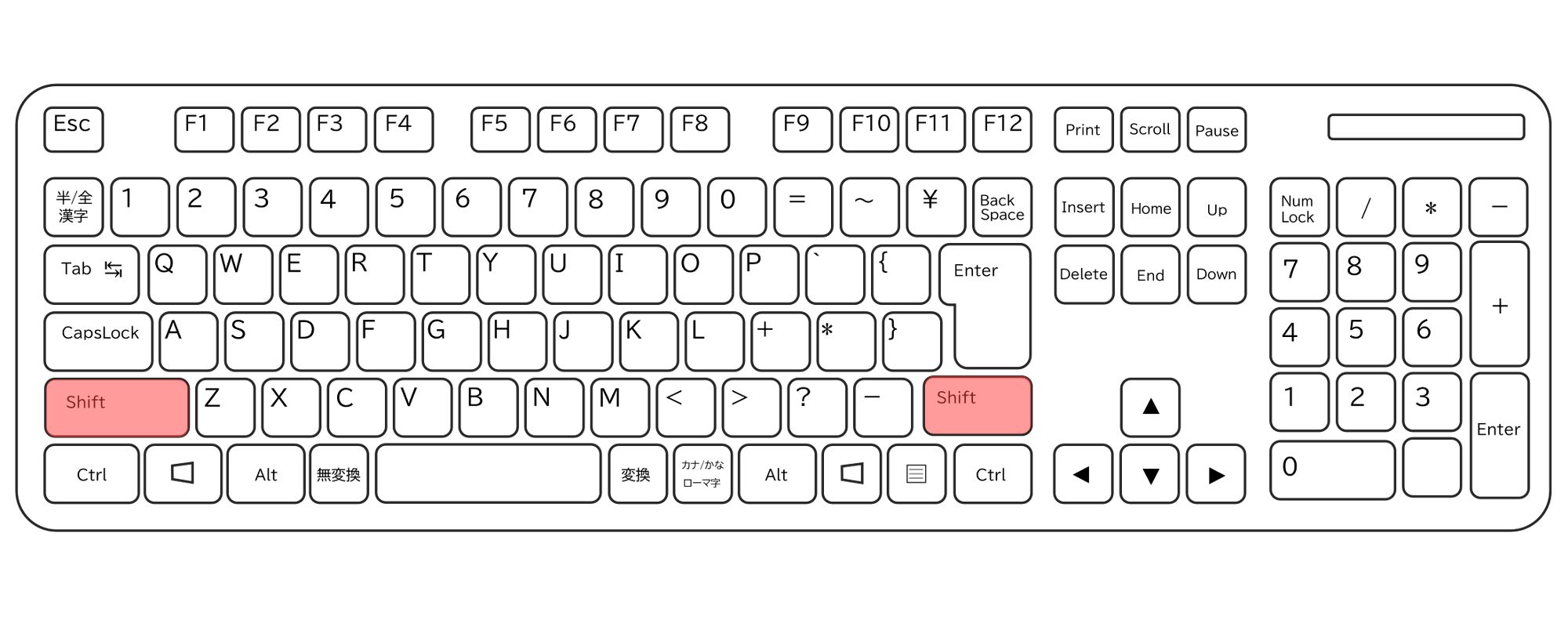 Shiftキーは主にアルファベットの大文字入力、記号の入力に必要なキーです。キーボードの右側と左側に一つずつ付いています。