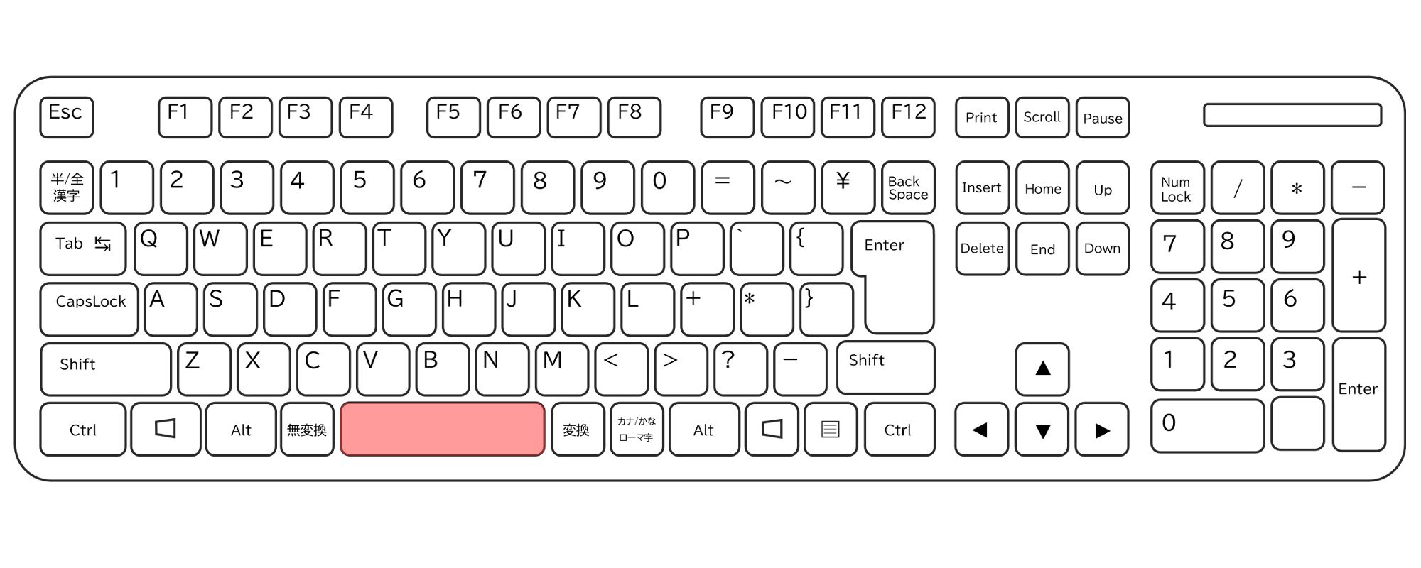 Spaceキーは文章に空白を入れたいとき、入力した文字を変換したいときに必要になるキーです。キーボードの中央下にある、横長のキーがSpaceキーです。