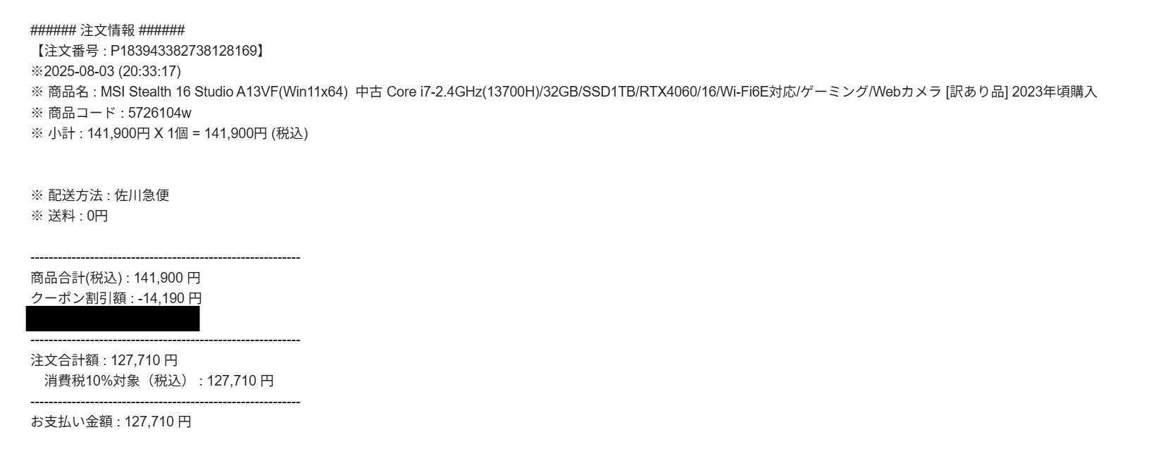 お値段は141,900円でしたが、会員登録特典の10%クーポンを使い127,710 円での購入となりました。ちなみに基本的なスペックは以下の通り。