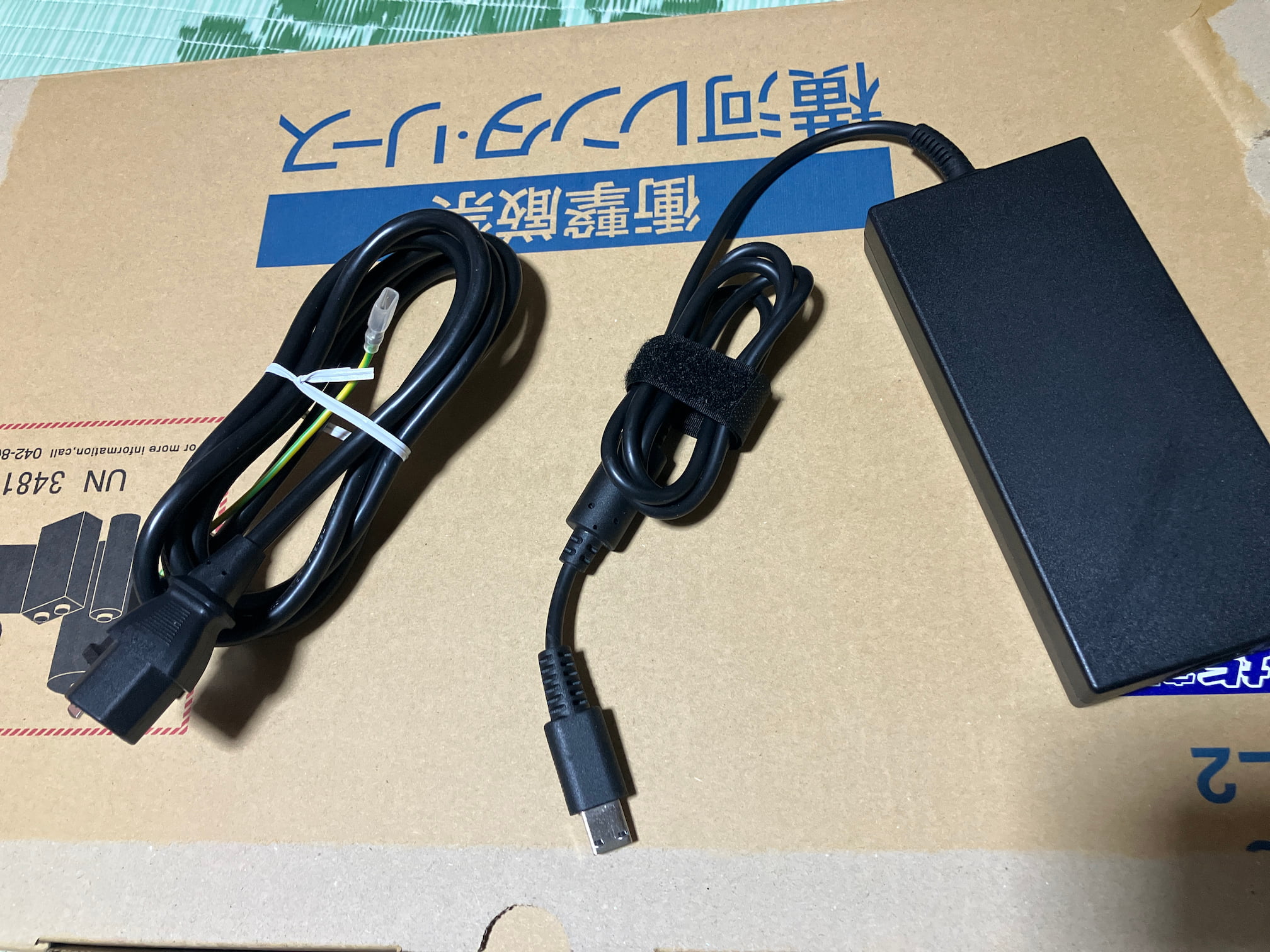 電源用のケーブルです。ゲーミングノート用のものなのでかなりサイズは大きめ。かつアース用のコードも付いていますね。