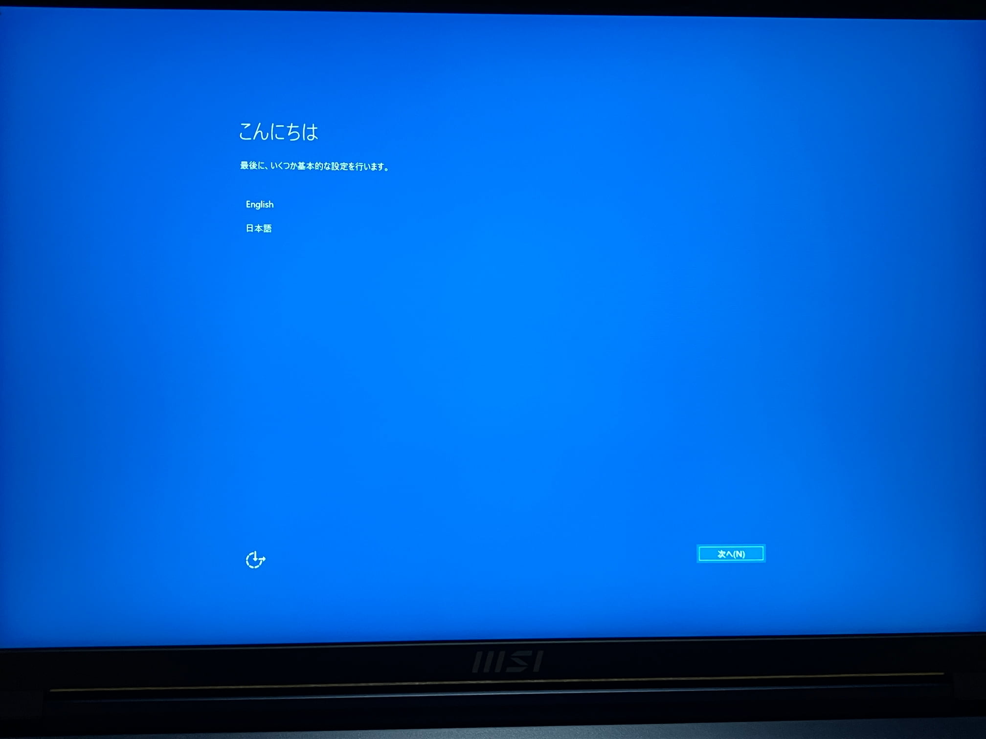 電源を入れてしばらく待つと、Windowsのセットアップ画面が表示されました。このままセットアップを進めていきます。
