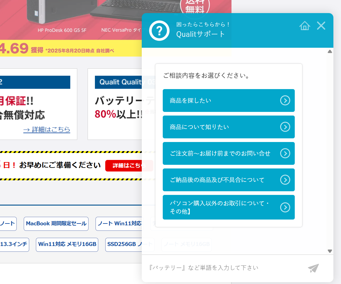 そんな方は中古パソコン専門ショップ「Qualit」に用意されているチャットツールを使ってパソコンを探してみるのがおすすめ。簡単な質問に答えるだけで、あなたにおすすめなスペックの中古パソコンを割り出してくれますよ、